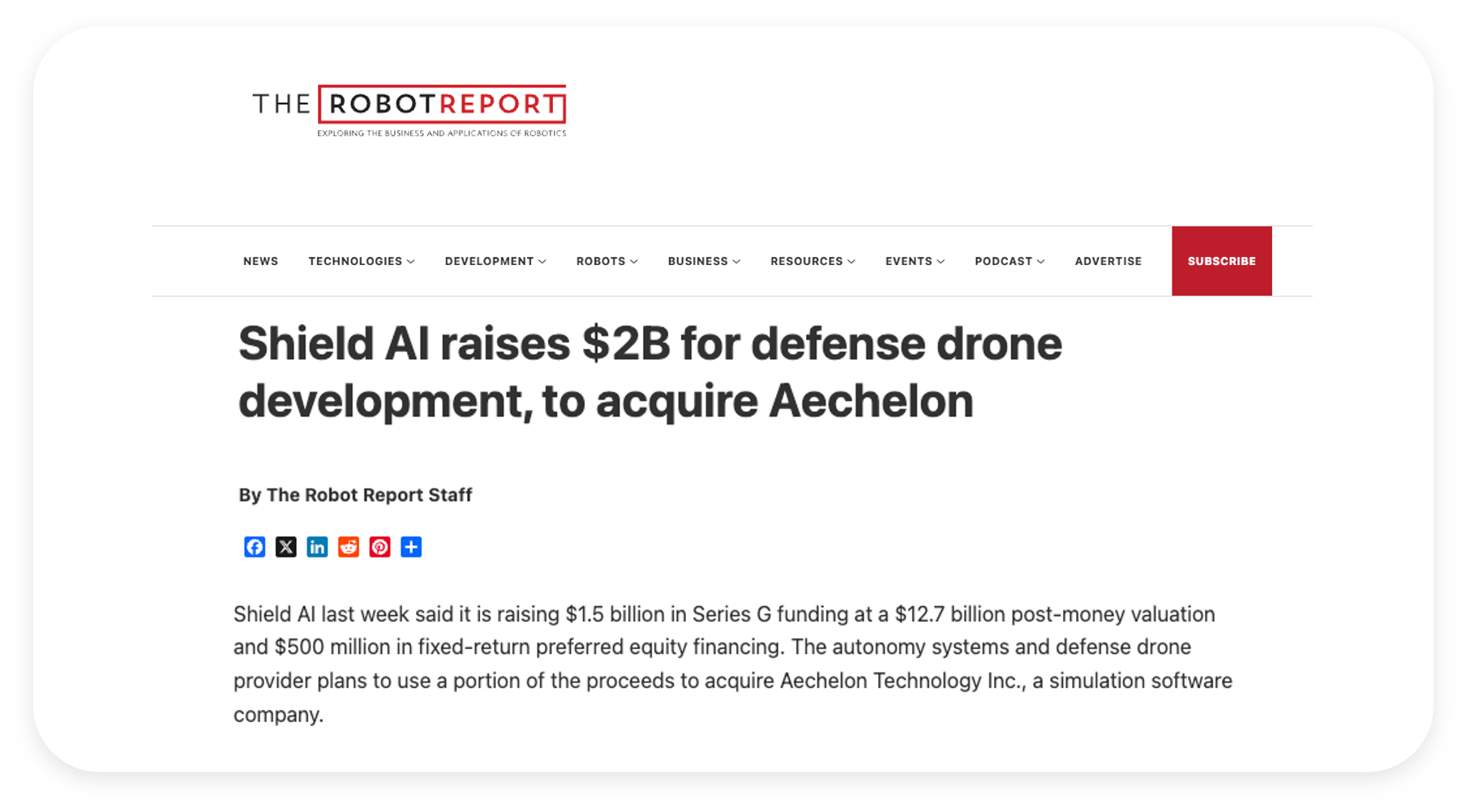 Aechelon’s acquisition by Shield AI marks a pivotal moment in the company’s evolution, positioning its technology at the center of next-generation autonomous defense systems. The transaction was completed as part of Shield AI’s $2 billion funding round, which valued the company at approximately $12.7 billion, underscoring the strategic importance of simulation in modern defense innovation.