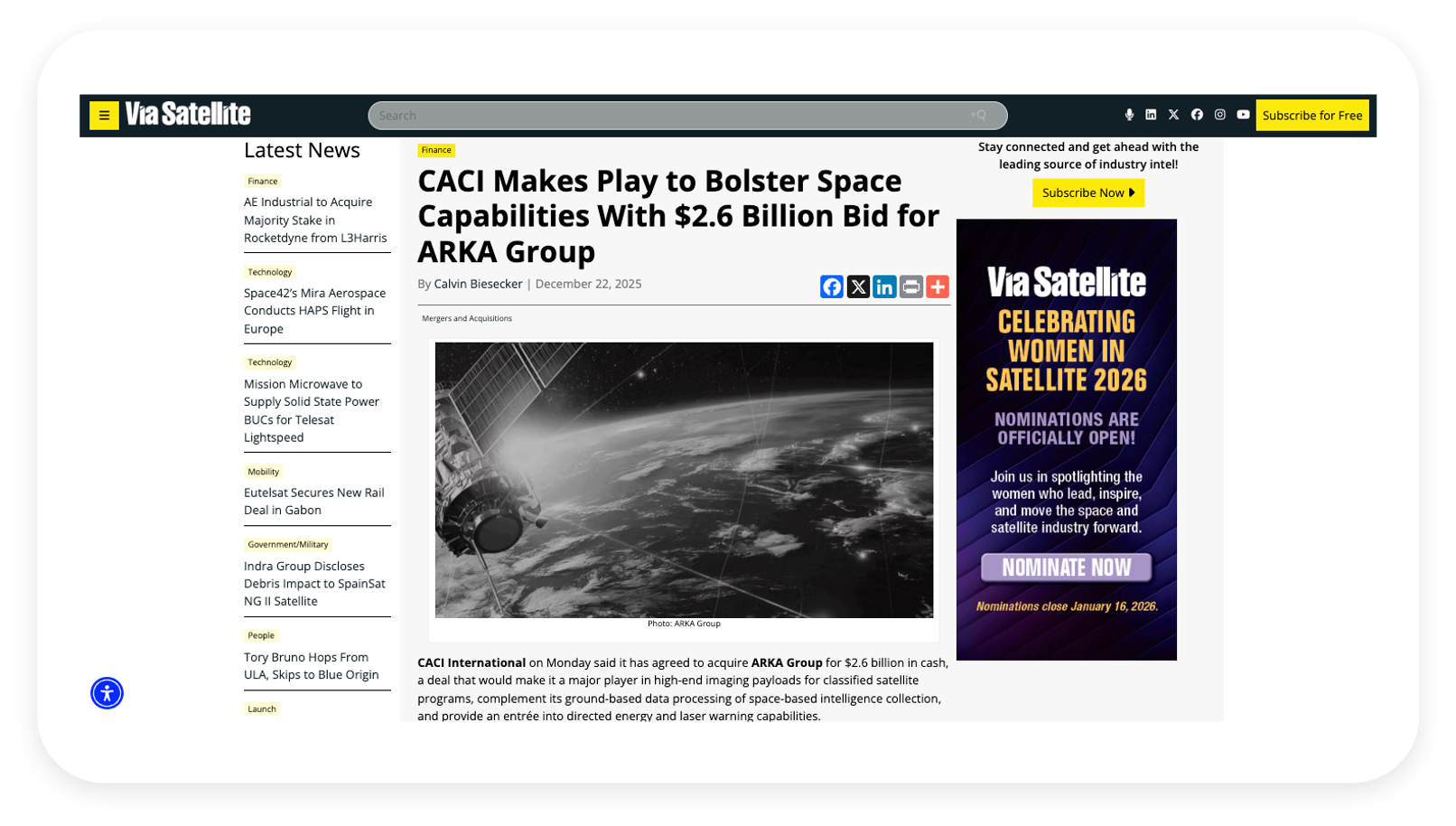With a unified identity and clearly articulated strategic value in the market, ARKA emerged as a differentiated, mission-aligned leader in space-based sensing and advanced technology integration. This clarity of positioning reinforced ARKA’s relevance to strategic buyers and helped showcase the scale, coherence, and future potential of the platform—culminating in its $2.6B acquisition by CACI and validating the role of strong brand alignment in driving enterprise value and successful M&A outcomes.