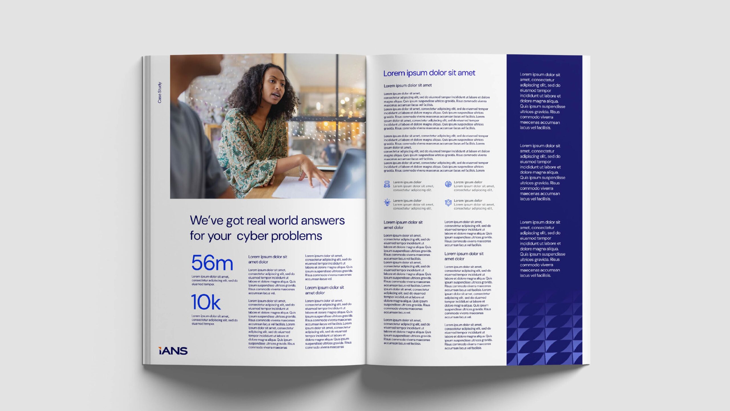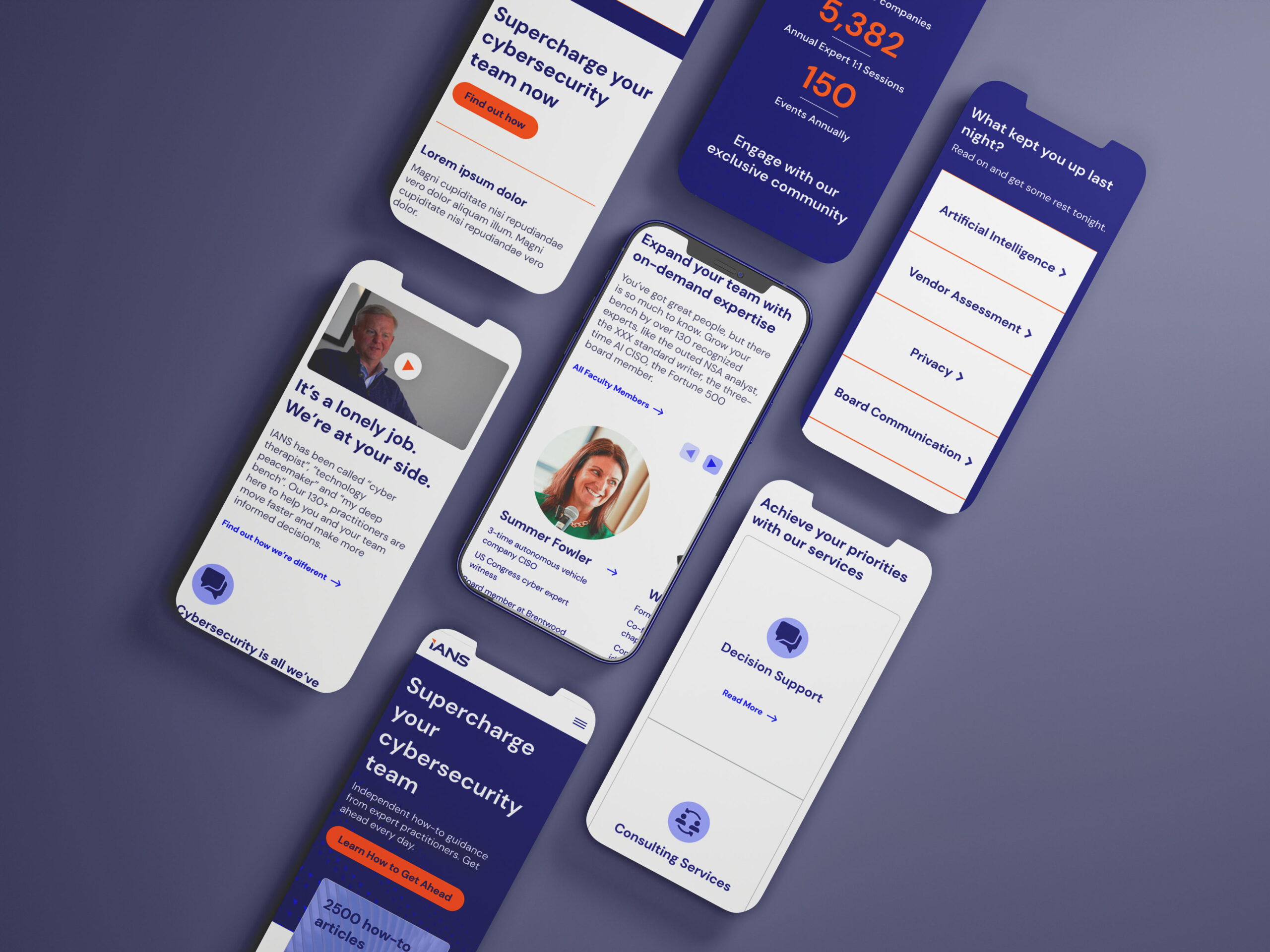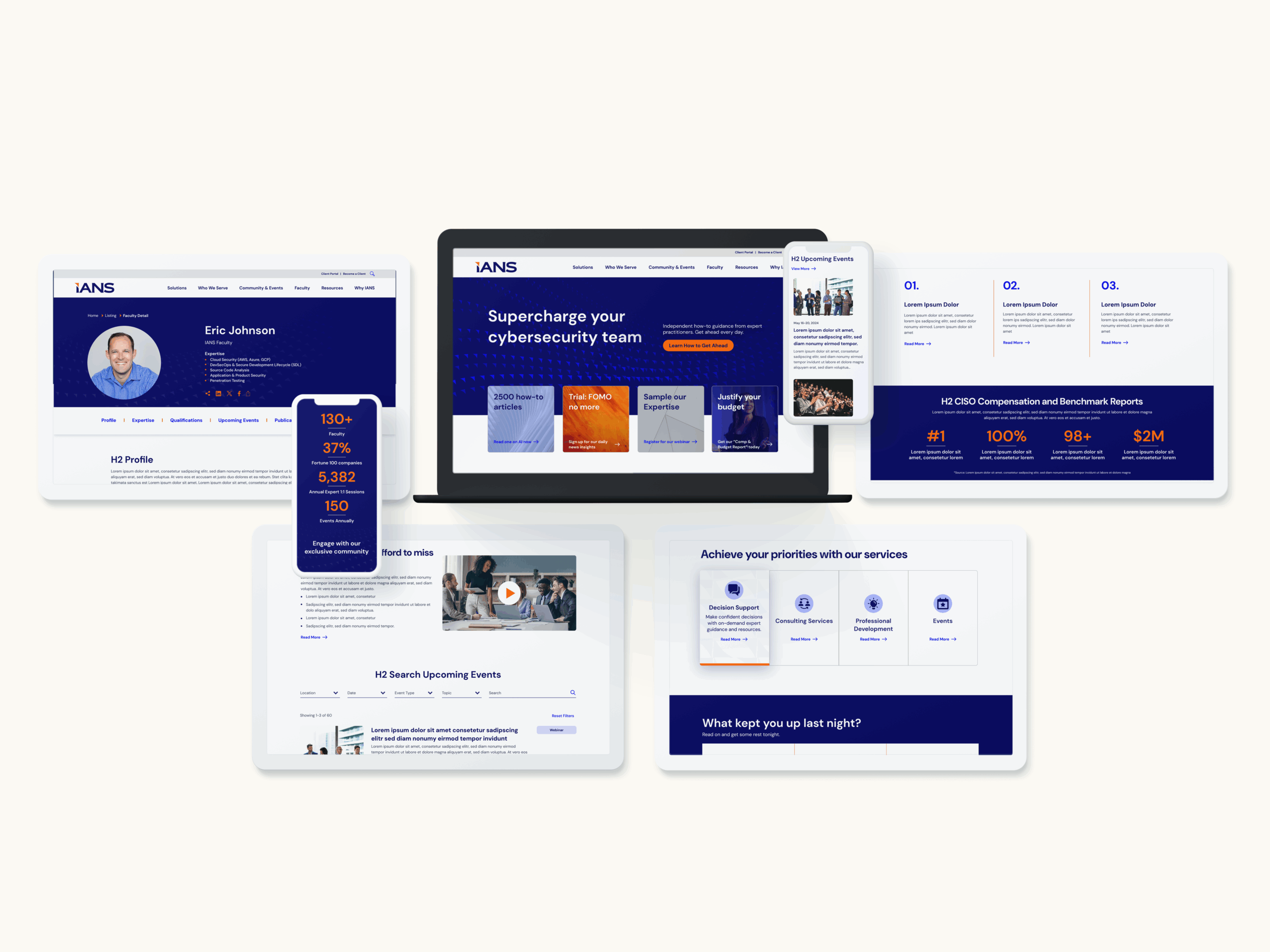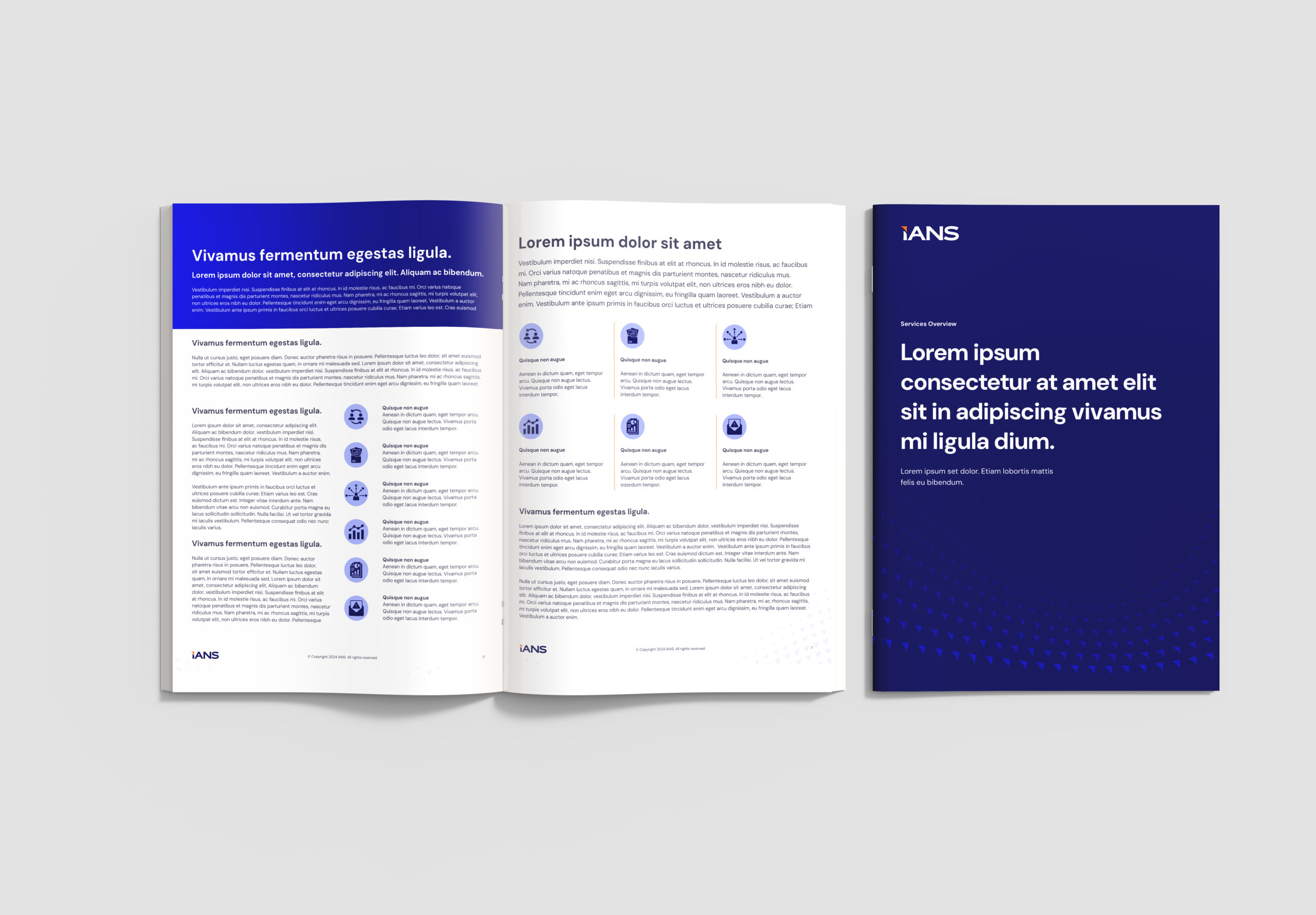 The project began with establishing a modern and cohesive brand foundation to better communicate IANS Research's deep expertise. This phase focused on creating a memorable and professional visual system. The work included designing a new logo and a comprehensive Corporate Visual Identity (CVI) guide, complete with standards for color palettes, typography, and imagery to ensure a unified look across all channels. Concurrently, strategic corporate messaging recommendations were developed to clarify and strengthen the brand's unique value proposition for its executive readership. To ensure immediate, consistent application of the new identity, the team also developed a suite of collateral templates, empowering the client to produce polished, on-brand materials immediately post-launch.