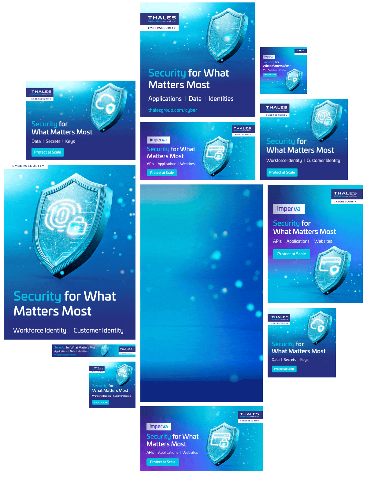 The second family adopted a foundational message, "Security for What Matters Most," visually represented by a meticulously crafted 3D cityscape encapsulated within a protective shield, immediately establishing Thales as the guardian of critical infrastructure and business continuity.
